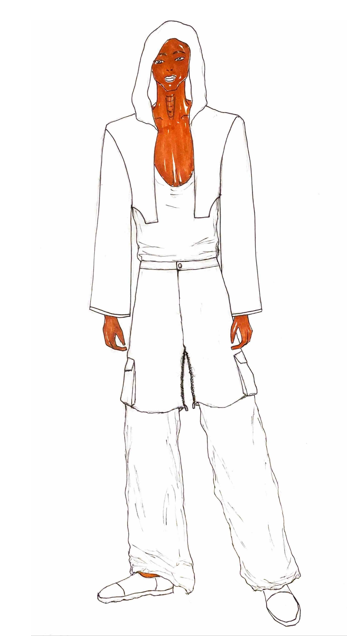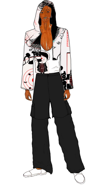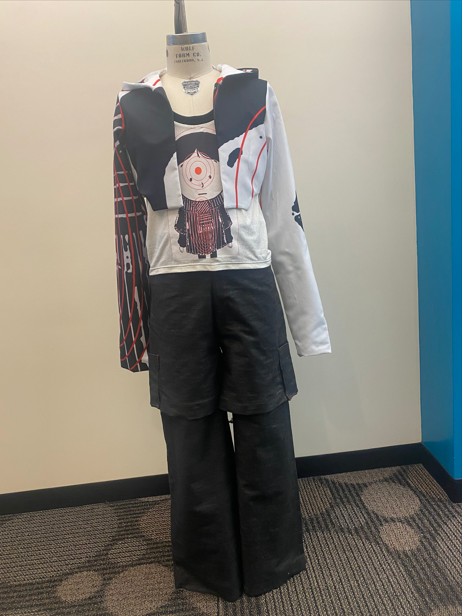 For the menswear look, the piece explores visibility, perception and the idea of being seen versus being defined. Graphic target motifs suggest systems of labeling and observation, placed directly onto the body as part of the silhouette. The garment questions how identity is constructed, whether it is self expressed or assigned, and turns the body into both, subject and statement.
